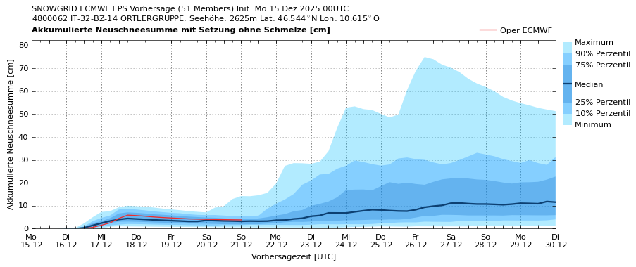 Secondo le previsioni a lungo termine attuali, fino alla settimana di Natale il tempo rimarrà secco e asciutto, e solamente dopo Natale i modelli prevedono delle nevicate, comunque deboli. Il pericolo di valanghe rimarrà debole.