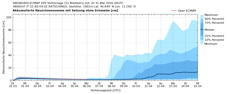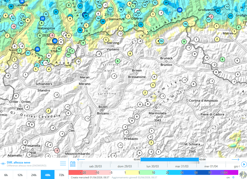 A partire dalla serata di lunedì, 30.03.2026, fino al pomeriggio di martedì, 31.03.2026, una perturbazione da nord ha portato presso la cresta di confine da 5 a 15 cm di neve fresca, localmente anche di più, accompagnati da vento da forte a tempestoso proveniente dai quadranti settentrionali.